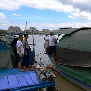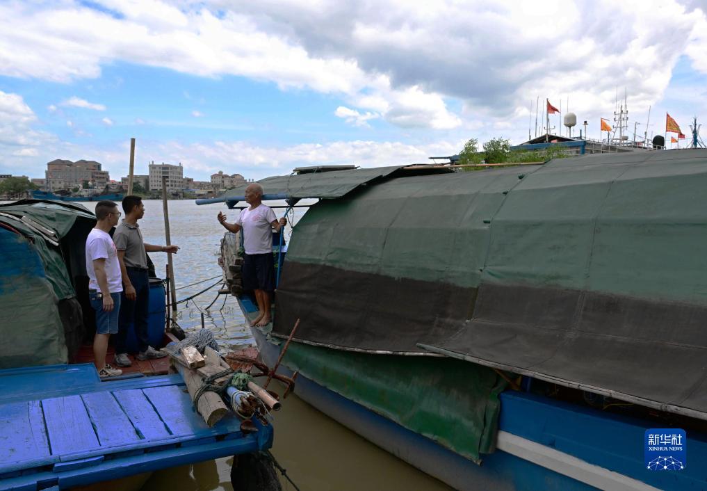 8月30日,在福建漳州市龍海區石碼鎮漁業(yè)社區漁船專(zhuān)用碼頭,當地漁業(yè)社區工作人員在勸說(shuō)船上漁民(右)上岸避風(fēng)。