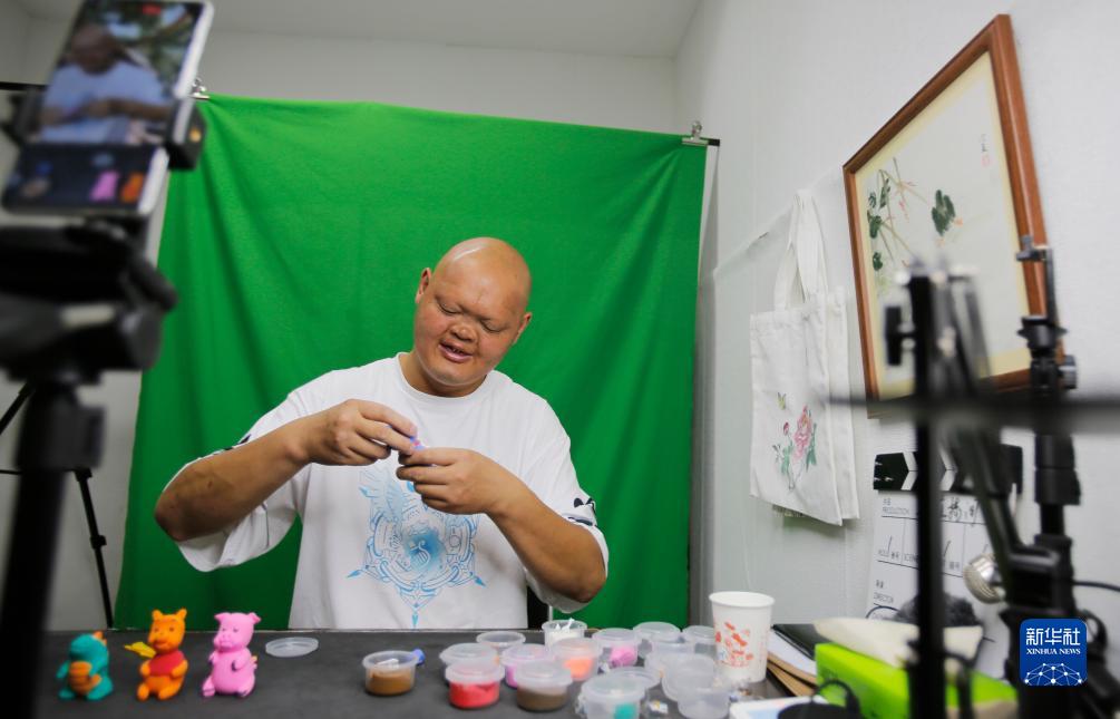 8月30日,在江蘇揚州小滿(mǎn)助殘就業(yè)創(chuàng )業(yè)基地,一名殘疾人士直播制作手工藝品。