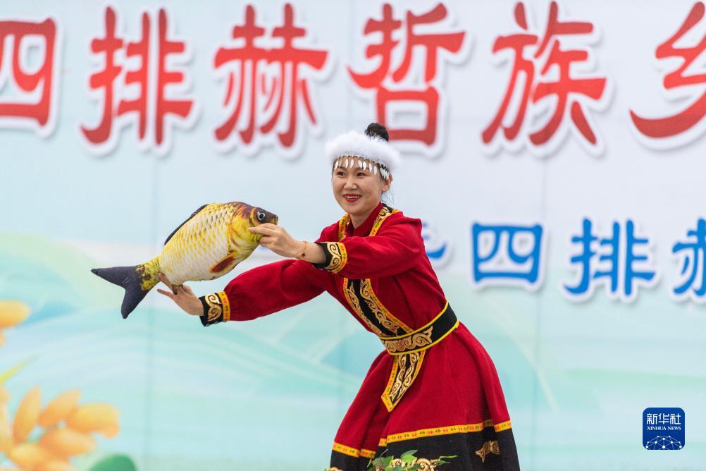 8月30日,在黑龍江省饒河縣四排赫哲族鄉,赫哲族人在河燈文化節上表演。