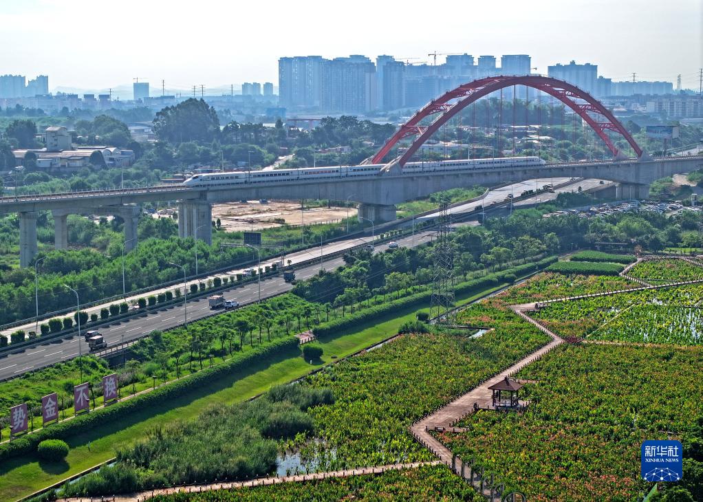 一列貴南高鐵列車(chē)駛過(guò)廣西南寧市那考河濕地公園(8月31日攝,無(wú)人機照片)。