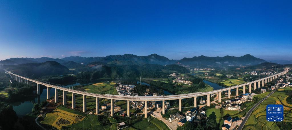 這是8月31日拍攝的位于貴州省都勻市境內的貴南高鐵營(yíng)盤(pán)清水河雙線(xiàn)特大橋(無(wú)人機全景照片)。