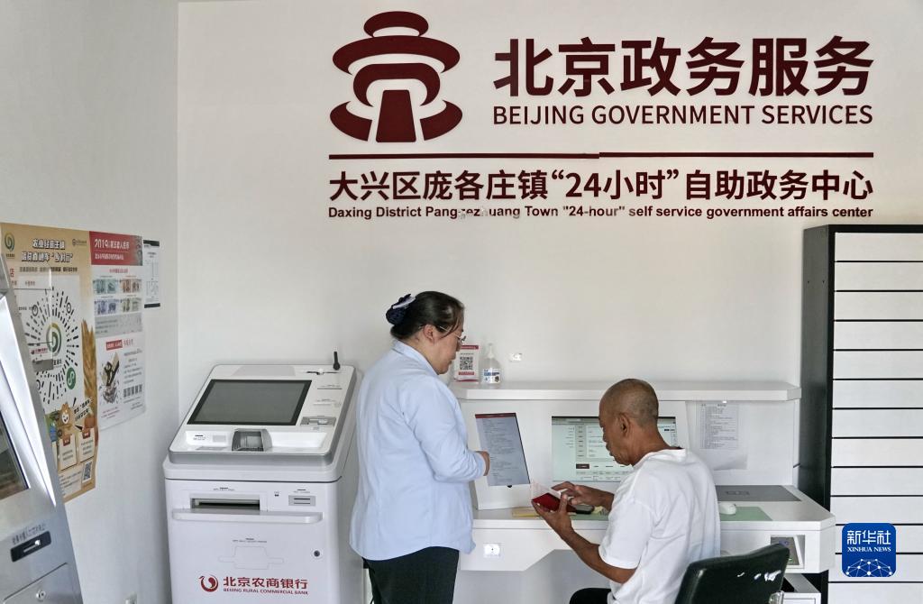 8月31日,大興區龐各莊鎮政務(wù)服務(wù)中心的工作人員幫助一位老人辦理金融業(yè)務(wù)。