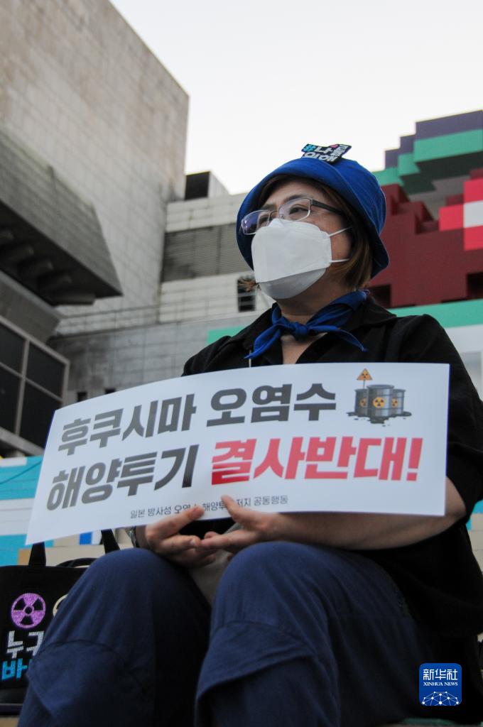 8月31日,一名市民手舉標語(yǔ)在韓國首爾光化門(mén)廣場(chǎng)附近參加集會(huì ),抗議日本核污染水排海。