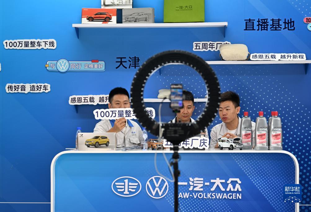 8月31日,在天津經(jīng)濟技術(shù)開(kāi)發(fā)區一汽-大眾華北基地,工作人員在儀式現場(chǎng)直播。