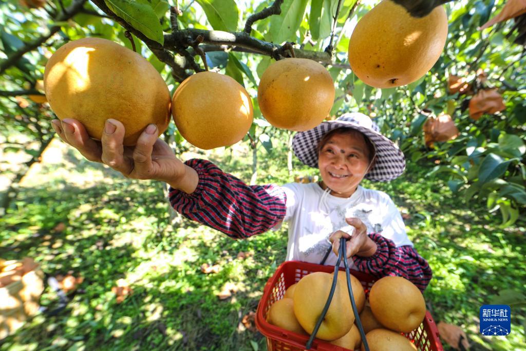 8月31日,果農在貴州省貴陽(yáng)市烏當區百宜鎮沙壩村采摘晚秋黃梨。