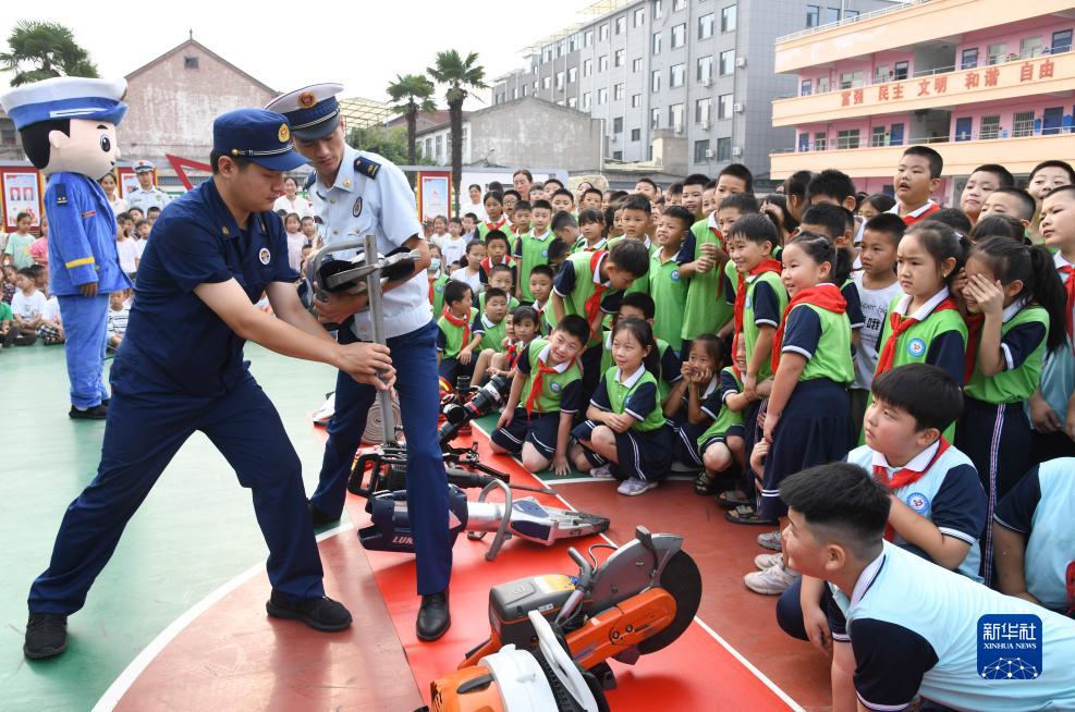 9月1日,在河南省濟源市文昌路小學(xué),濟源市消防救援支隊消防員為學(xué)生介紹消防救援設備。