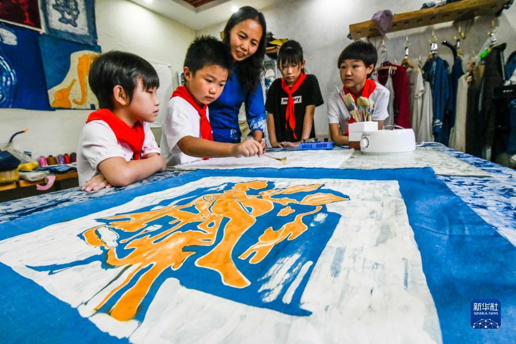 9月1日,河北省唐山市路北區興盛麗景小學(xué)的學(xué)生在蠟染作坊練習蠟染技藝。