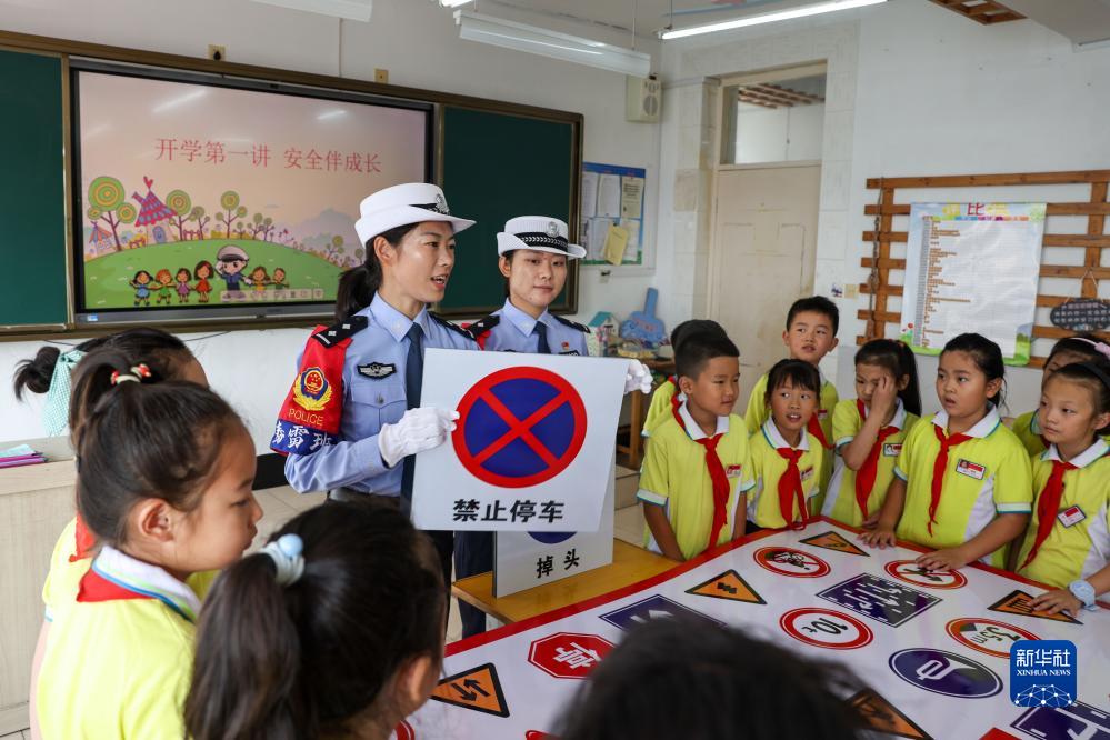 9月1日,在山東省榮成市府新小學(xué)的“開(kāi)學(xué)第一課”上,交警為小學(xué)生講解交通安全標識。