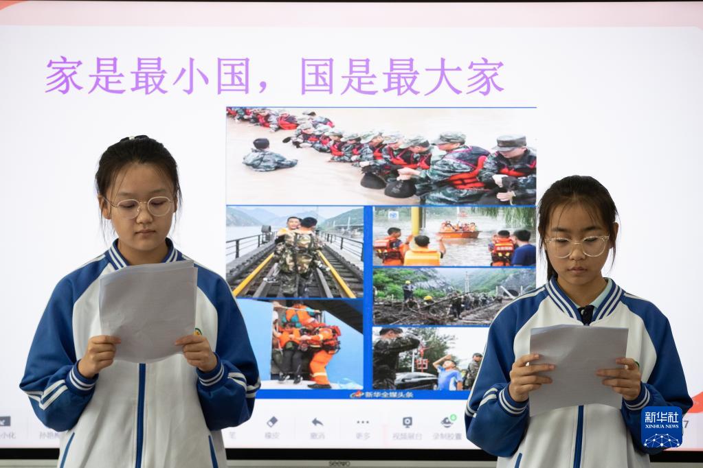 9月1日,在哈爾濱市延壽縣第四中學(xué),學(xué)生在開(kāi)學(xué)第一課上講述抗洪故事。