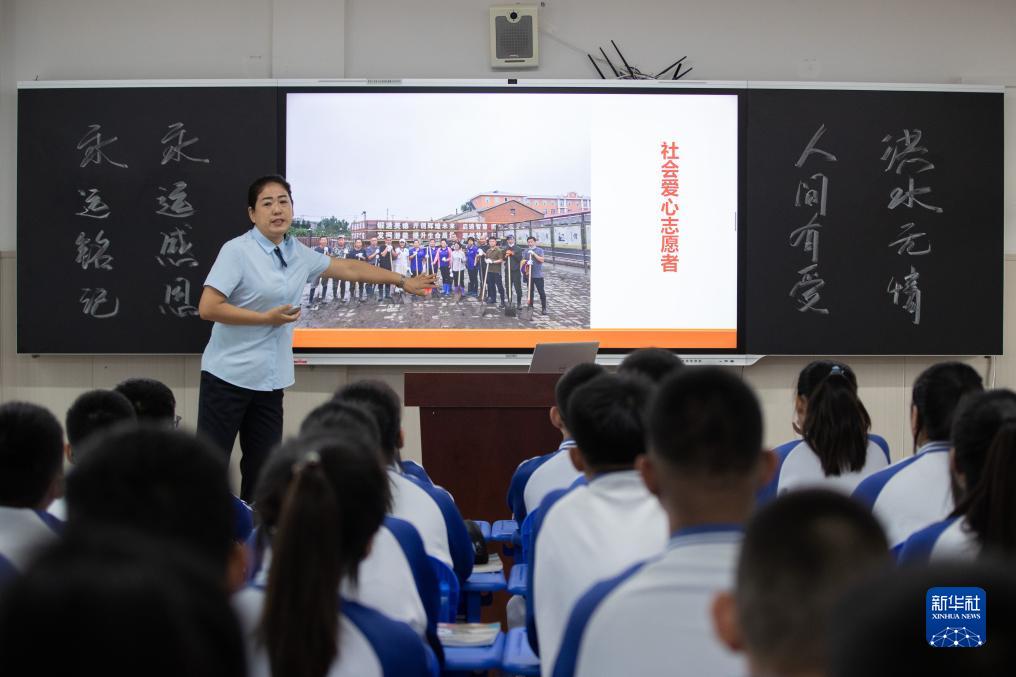 9月1日,在哈爾濱市延壽縣第四中學(xué),一名教師在開(kāi)學(xué)第一課上講述校園重建的故事。