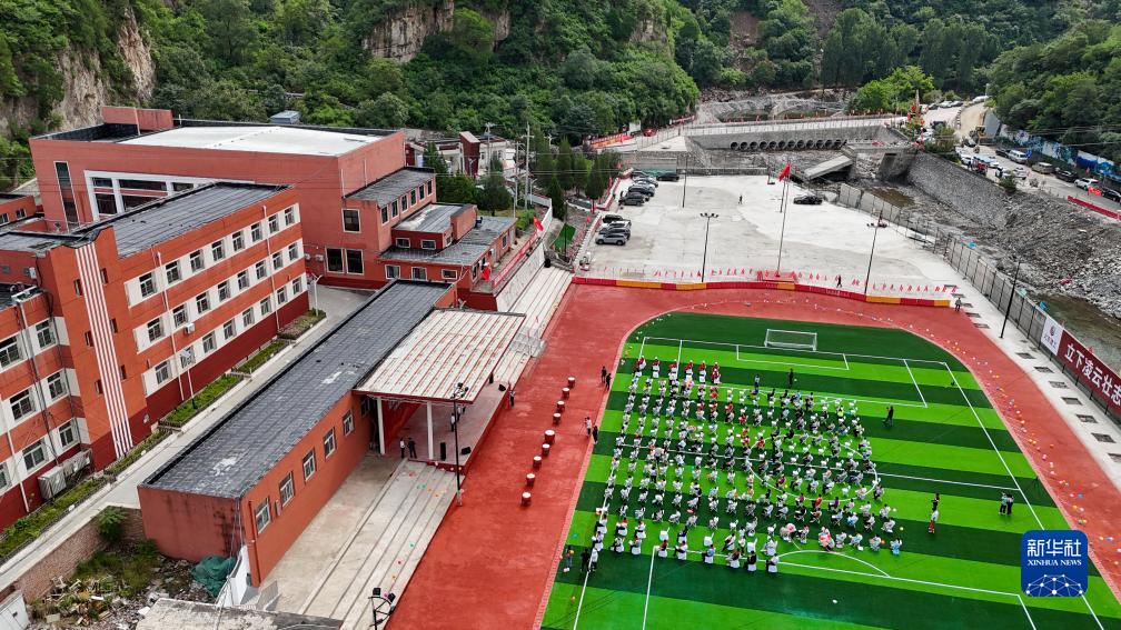 9月1日,在北京市房山區霞云嶺鄉霞云嶺中心小學(xué),老師和學(xué)生在修繕一新的操場(chǎng)上參加開(kāi)學(xué)典禮(無(wú)人機照片)。
