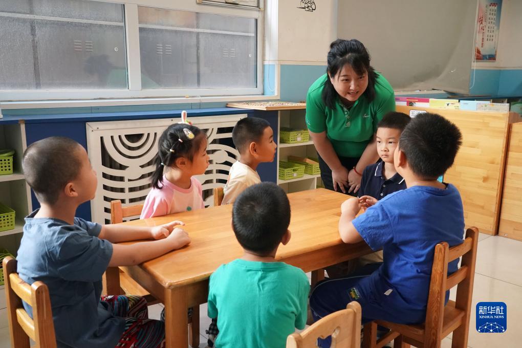 9月1日,在北京市門(mén)頭溝區京師實(shí)驗小學(xué)借址開(kāi)學(xué)的京師實(shí)驗小學(xué)附屬幼兒園大班小朋友們與老師交流。