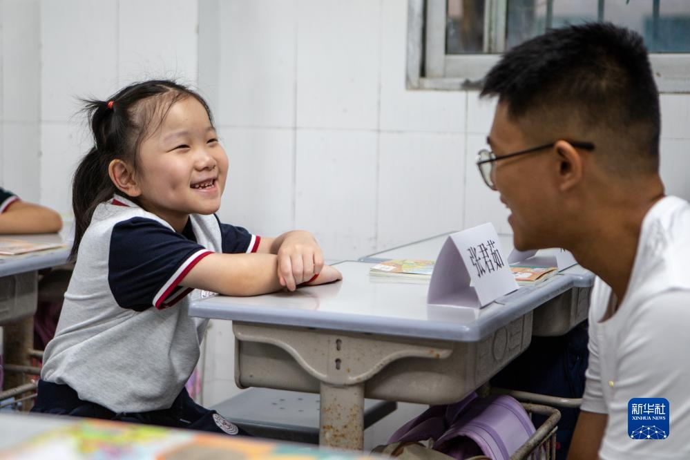9月1日,在重慶育才實(shí)驗學(xué)校華巖校區,豆豆在教室內和老師交流。