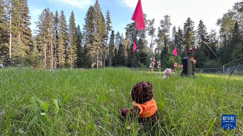 這是8月31日在加拿大薩斯喀徹溫省博瓦爾印第安人寄宿學(xué)校舊址拍攝的用粉色旗子標出的疑似兒童和嬰兒墓地。