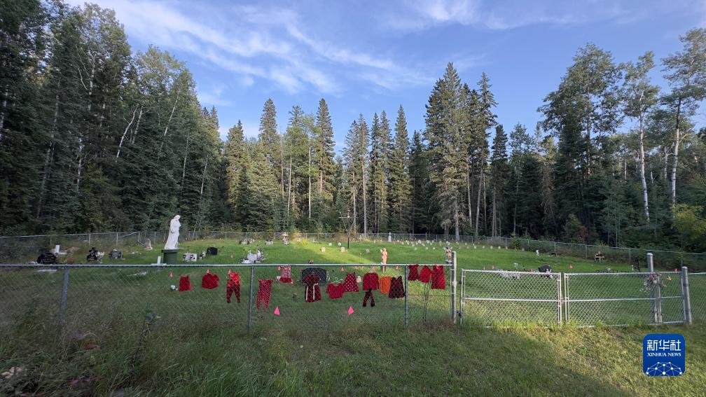這是8月31日在加拿大薩斯喀徹溫省博瓦爾印第安人寄宿學(xué)校舊址拍攝的用粉色旗子標出的疑似兒童和嬰兒墓地。