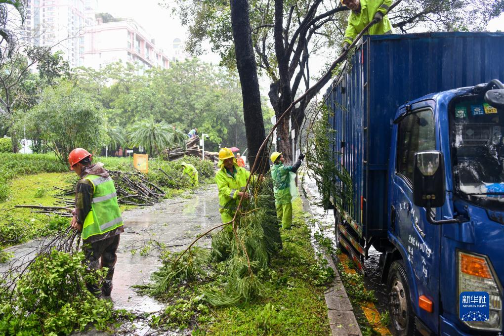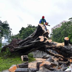 9月2日,在廣東深圳主干道深南大道邊,綠化工人冒雨清理樹(shù)枝。
