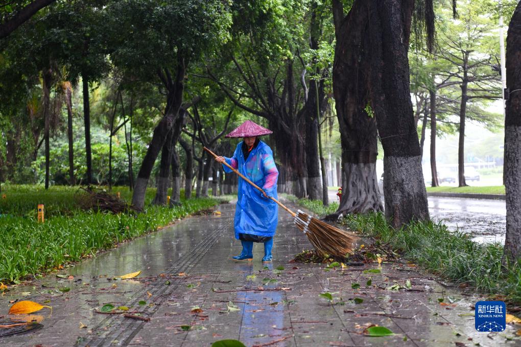 9月2日,在深圳主干道深南大道邊,環(huán)衛工人冒雨清理樹(shù)葉。
