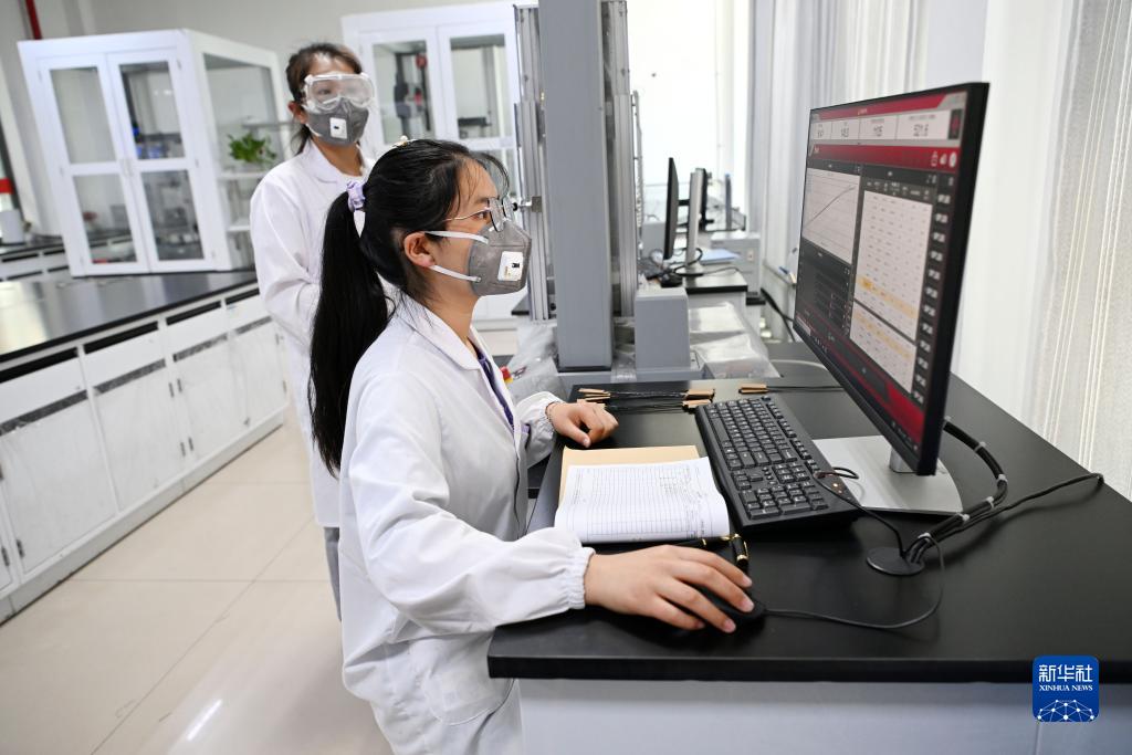 在中國建材集團西寧萬(wàn)噸碳纖維生產(chǎn)基地實(shí)驗室內,工作人員對碳纖維拉力進(jìn)行測試(8月27日攝)。