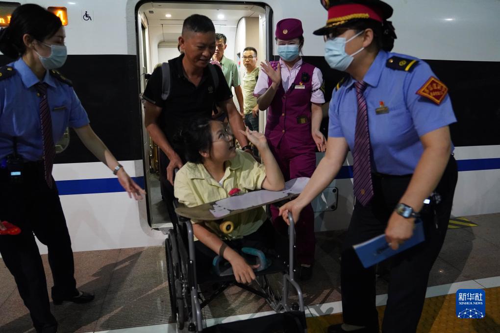 到站后,蔣張子怡向鐵路工作人員致謝(8月31日攝)。