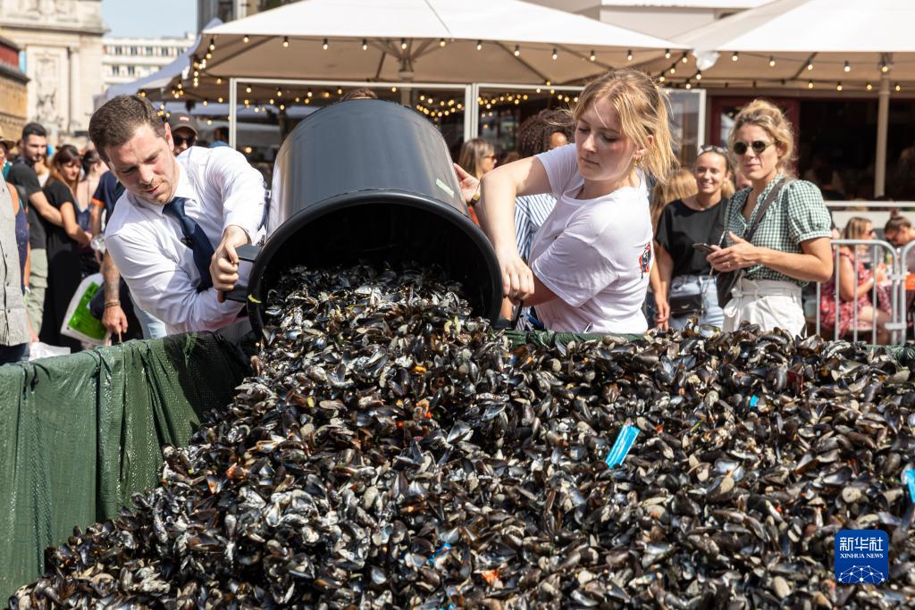 9月3日,在法國里爾舊貨市場(chǎng)上,工作人員傾倒顧客就餐后留下的貽貝殼。