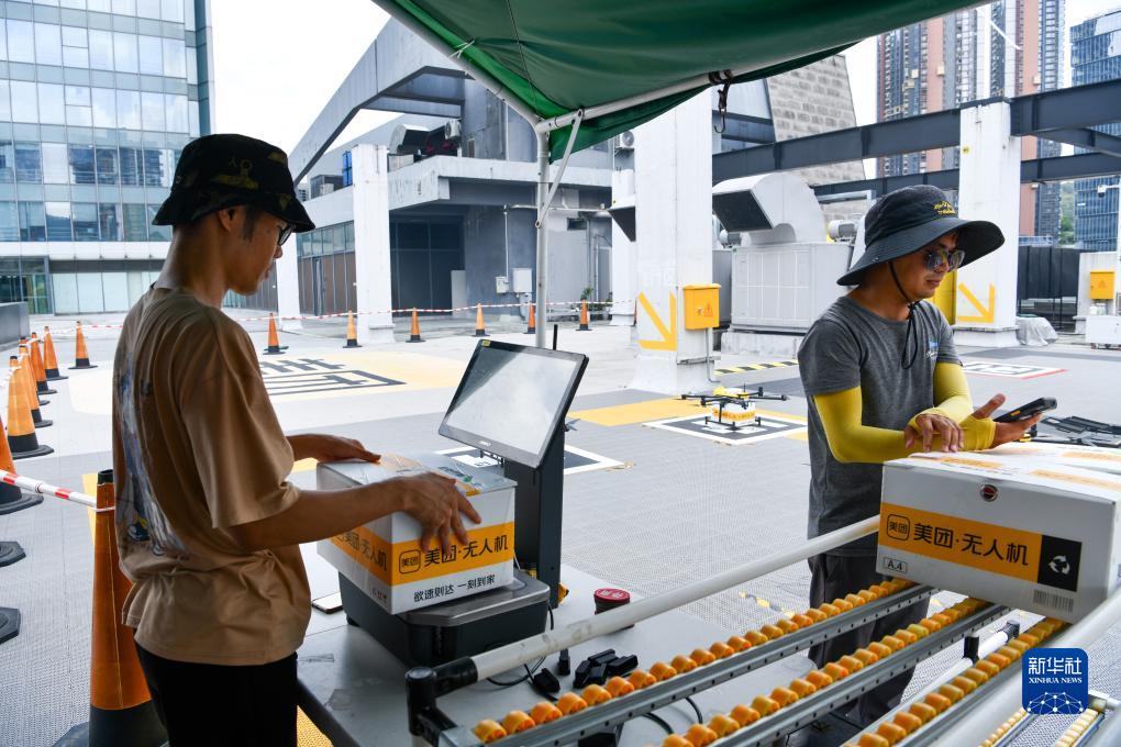 在深圳市龍崗區一處無(wú)人機起飛場(chǎng),工作人員將外賣(mài)裝箱、掃描(8月15日攝)。