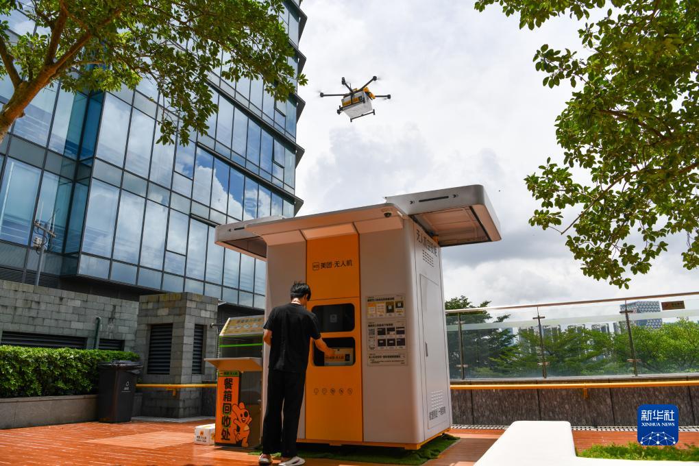 午間用餐高峰時(shí)段,顧客在深圳市龍華區一處美團無(wú)人機空投柜取餐(8月15日攝)。