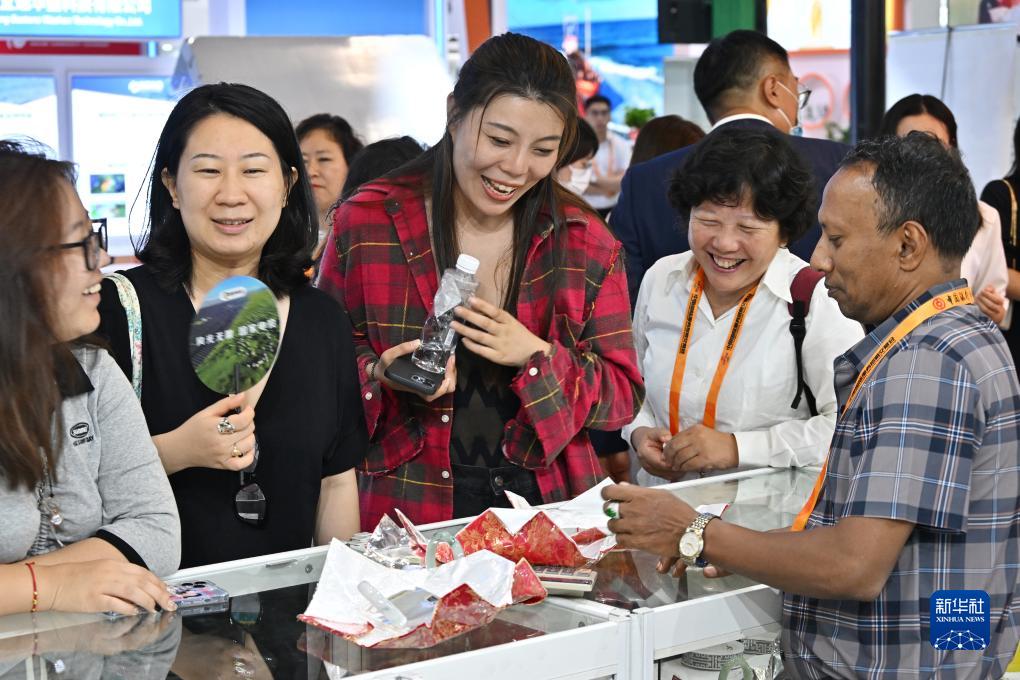 9月4日,參觀(guān)者在服貿會(huì )國家會(huì )議中心的緬甸展臺了解并挑選翡翠飾品。