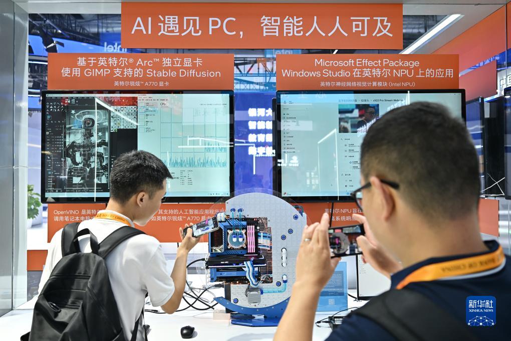 9月4日,兩名參觀(guān)者在服貿會(huì )國家會(huì )議中心的英特爾展臺拍攝一款獨立顯卡。