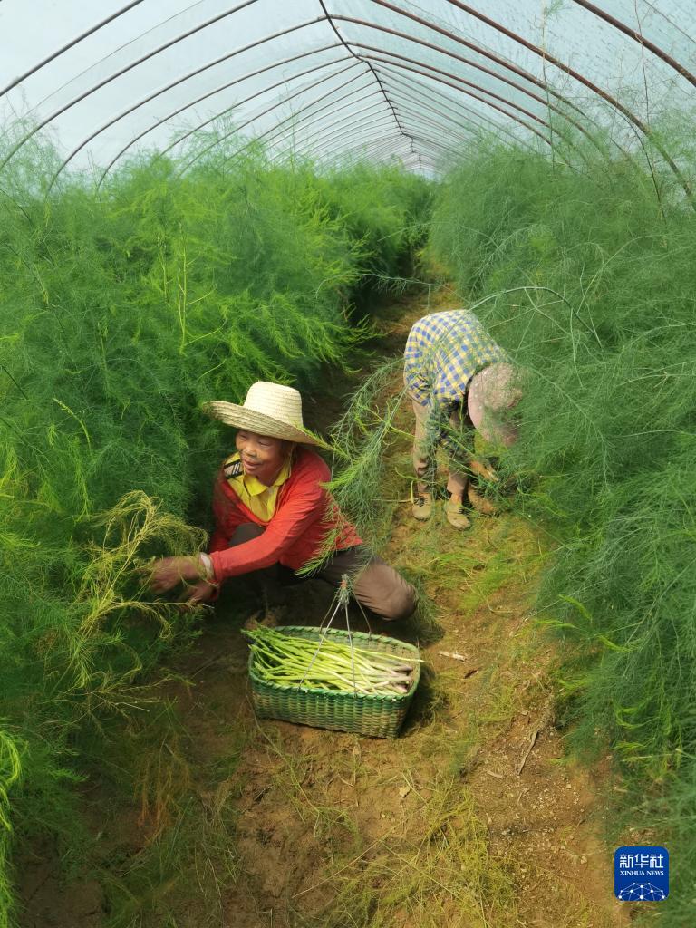 9月4日,在江西省南昌市石埠鎮西崗村“夢(mèng)飛田園”蘆筍產(chǎn)業(yè)示范區種植基地,村民在大棚里采收蘆筍。