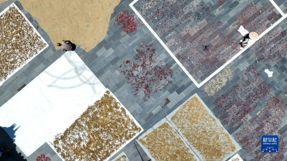 9月4日,村民在貴州省黔東南苗族侗族自治州錦屏縣大同鄉秀洞村廣場(chǎng)晾曬農作物(無(wú)人機照片)。