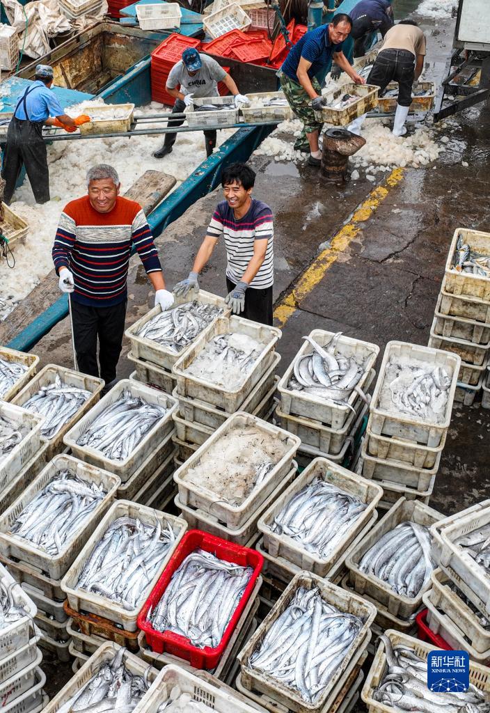 當日,山東省榮成市成山鎮落鳳漁港一派繁忙景象,秋捕歸來(lái)的漁船滿(mǎn)載而歸,靠港卸魚(yú)。