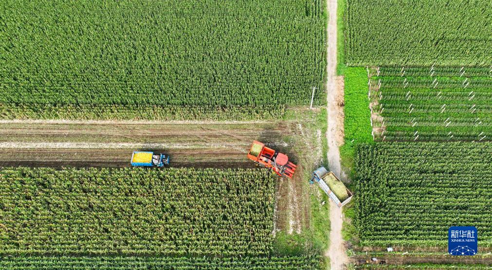 9月5日,河北省唐山市海港經(jīng)濟開(kāi)發(fā)區王灘鎮的農民駕駛農機收獲玉米(無(wú)人機照片)。