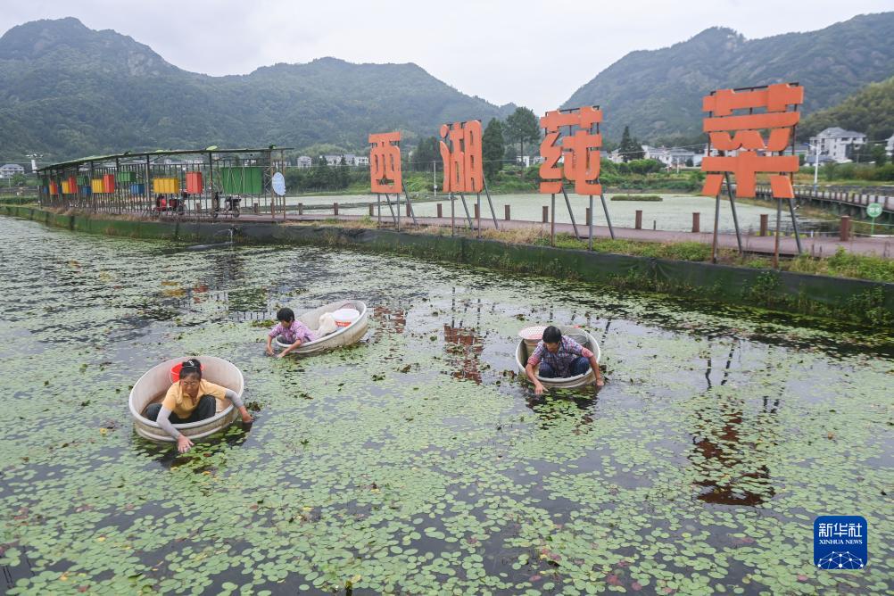 9月5日,在建德市航頭鎮烏龍村莼菜基地,村民劃著(zhù)“盆船”在西湖莼菜產(chǎn)業(yè)園種植基地的水面上采摘西湖莼菜。