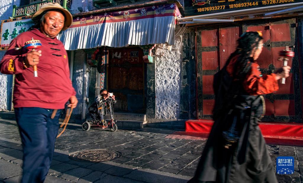 拉巴頓珠(后)在清晨的八廓街拍攝(9月3日攝)。