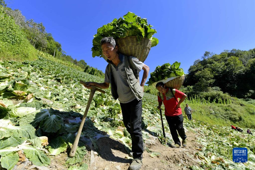9月5日,在湖北省宣恩縣椿木營(yíng)鄉挖斷山村的高山蔬菜地里,農民運送大白菜。
