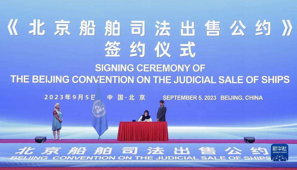 9月5日,沙特阿拉伯代表在《北京船舶司法出售公約》簽約儀式上簽字。