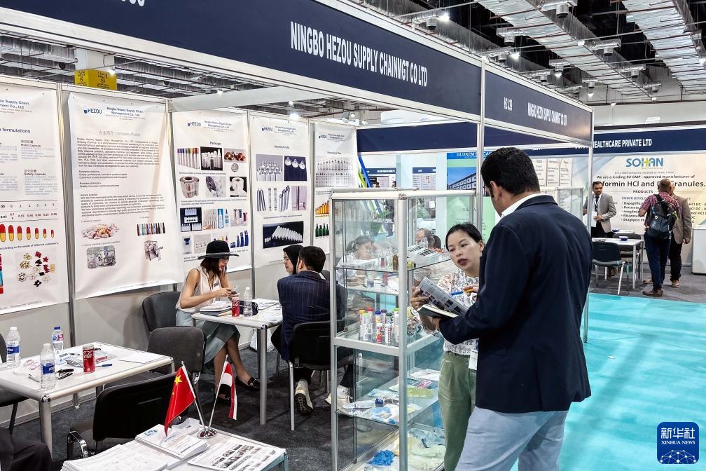 9月3日,在埃及開(kāi)羅舉辦的2023埃及醫藥展上,參觀(guān)者在一家中國醫藥企業(yè)的展位上了解信息。
