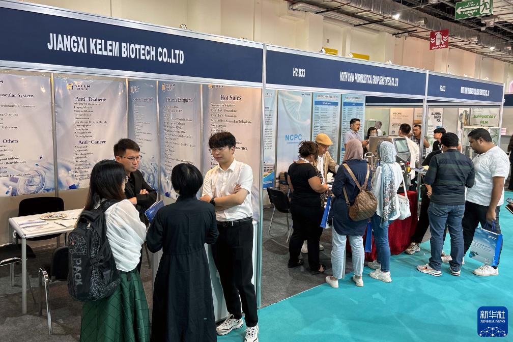 9月3日,在埃及開(kāi)羅舉辦的2023埃及醫藥展上,參觀(guān)者在中國醫藥企業(yè)的展位前了解信息。