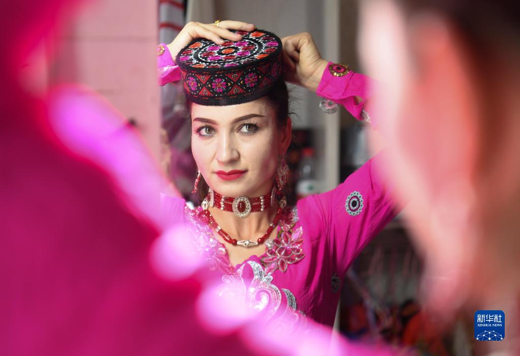 在新疆塔什庫爾干塔吉克自治縣帕米爾旅游區游客服務(wù)中心,縣文工團演員在演出前做準備(9月4日攝)。