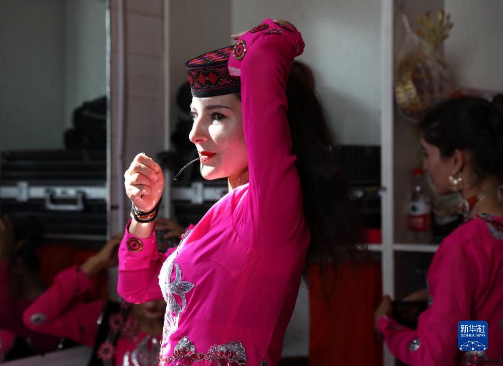 在新疆塔什庫爾干塔吉克自治縣帕米爾旅游區游客服務(wù)中心,縣文工團演員在演出前做準備(9月4日攝)。