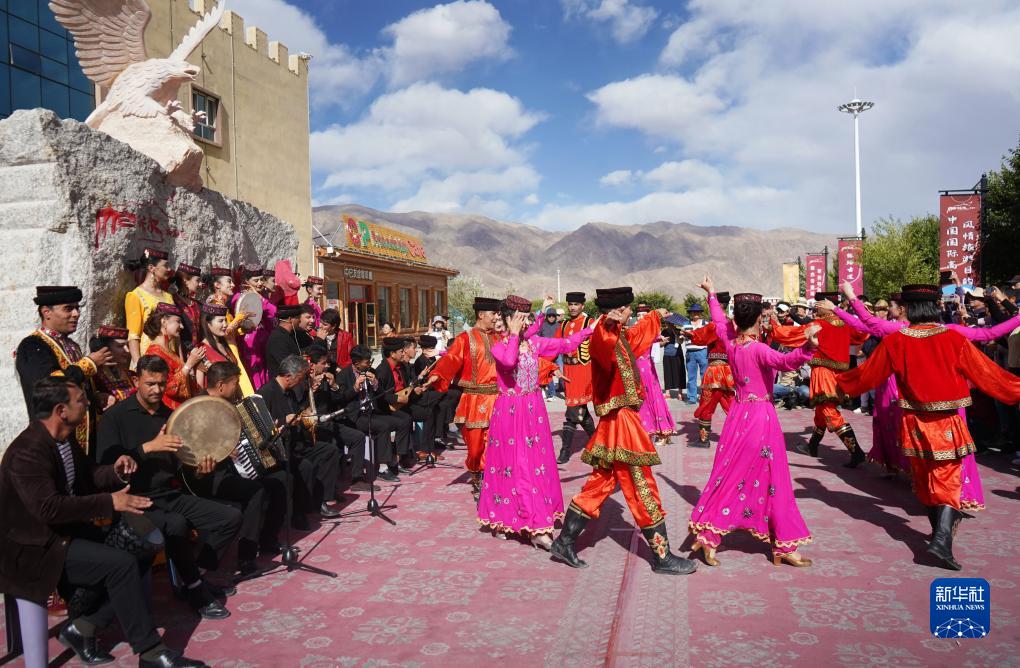 在新疆塔什庫爾干塔吉克自治縣帕米爾旅游區游客服務(wù)中心,縣文工團演員唱歌跳舞歡迎游客(9月4日攝)。