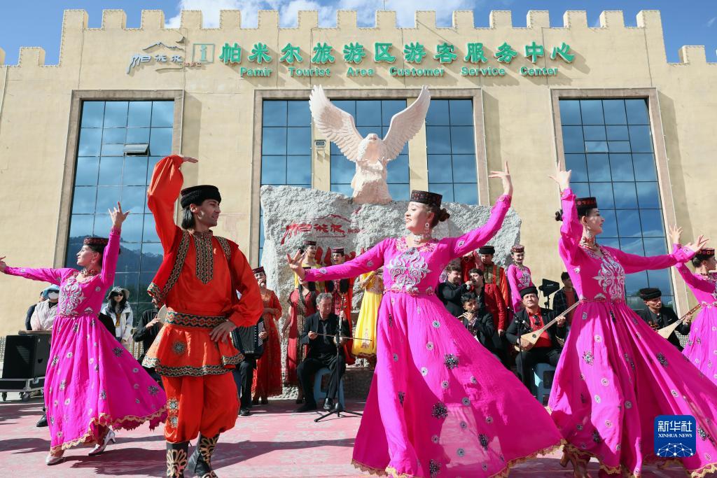 在新疆塔什庫爾干塔吉克自治縣帕米爾旅游區游客服務(wù)中心,縣文工團演員跳舞歡迎游客(9月4日攝)。