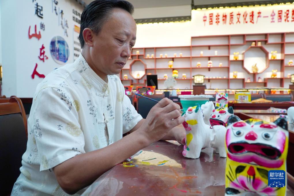 9月5日,在山東省高密市姜莊鎮的一處非遺工坊,非遺代表性傳承人聶臣希在制作泥老虎產(chǎn)品。