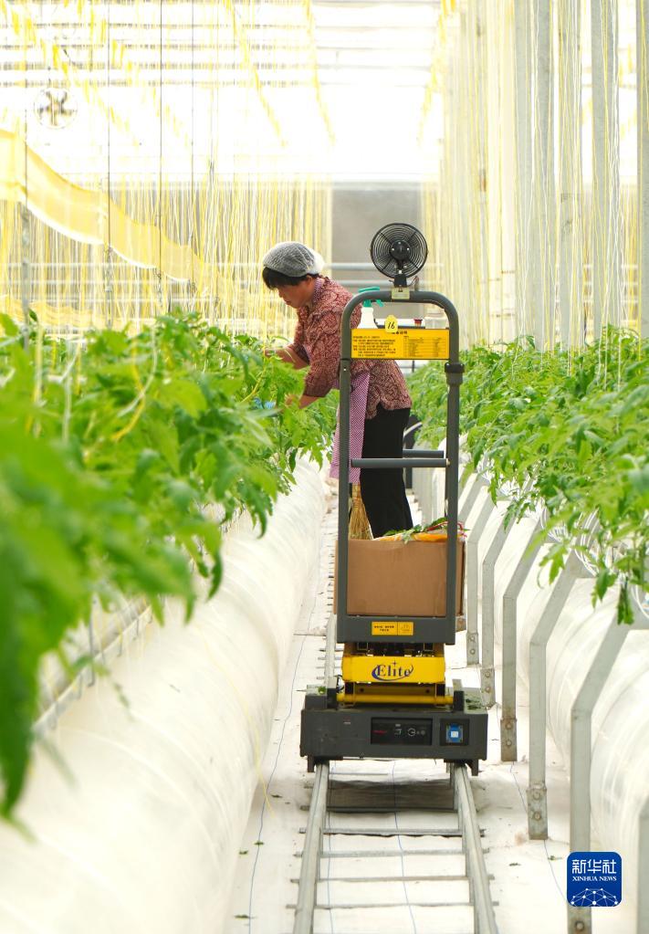 9月6日,在山東省昌邑市飲馬鎮,蔬菜種植戶(hù)在高標準種植大棚里培育西紅柿秧苗。