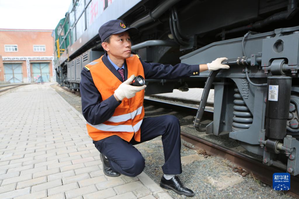 9月6日,在齊齊哈爾機務(wù)段滿(mǎn)洲里運用車(chē)間,中歐班列出境司機進(jìn)行發(fā)車(chē)前的檢查。