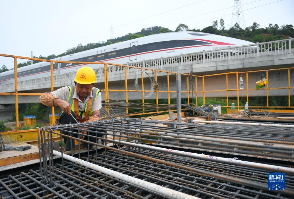 9月6日,中鐵四局施工人員在深江鐵路深圳段高峰水庫大橋上進(jìn)行主墩施工。