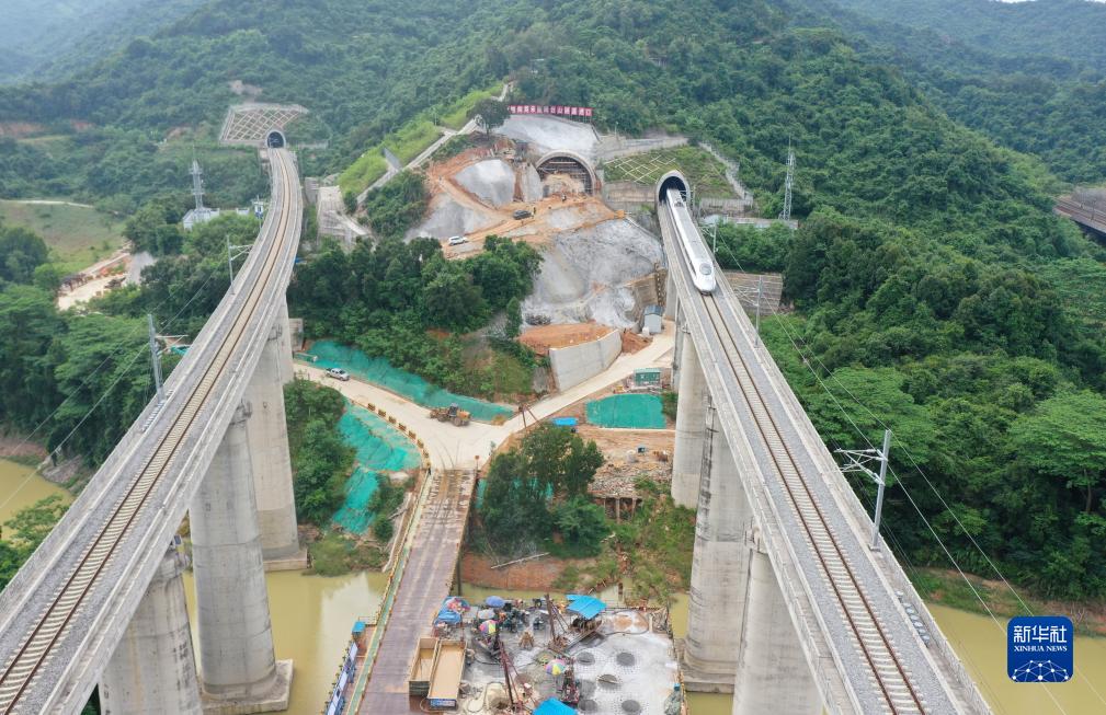 9月6日,贛深鐵路列車(chē)從在建的深江鐵路深圳段陽(yáng)臺山隧道旁駛過(guò)(無(wú)人機照片)。