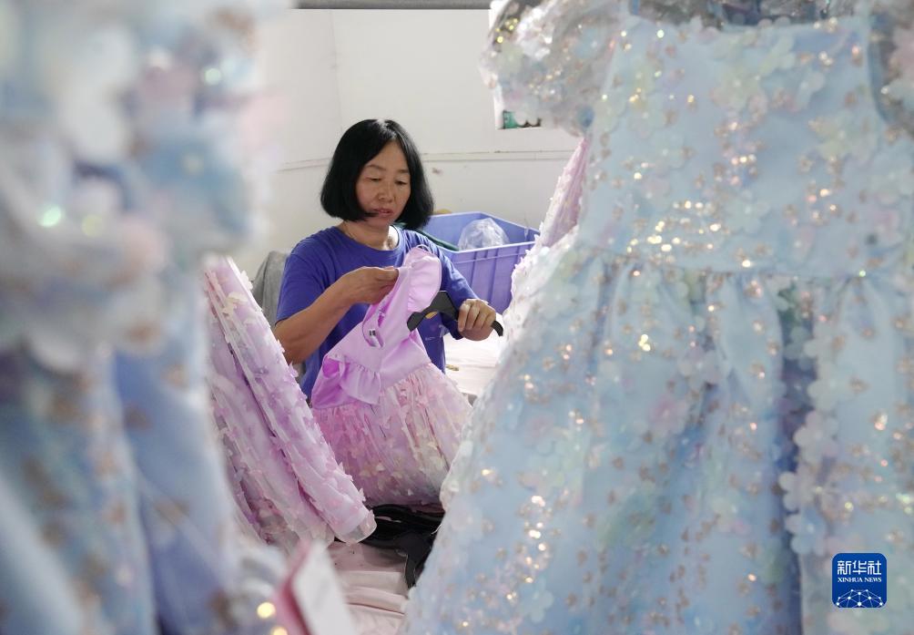 9月6日,工人在遵化市石門(mén)鎮一家服裝加工企業(yè)的成品車(chē)間整理童裝。