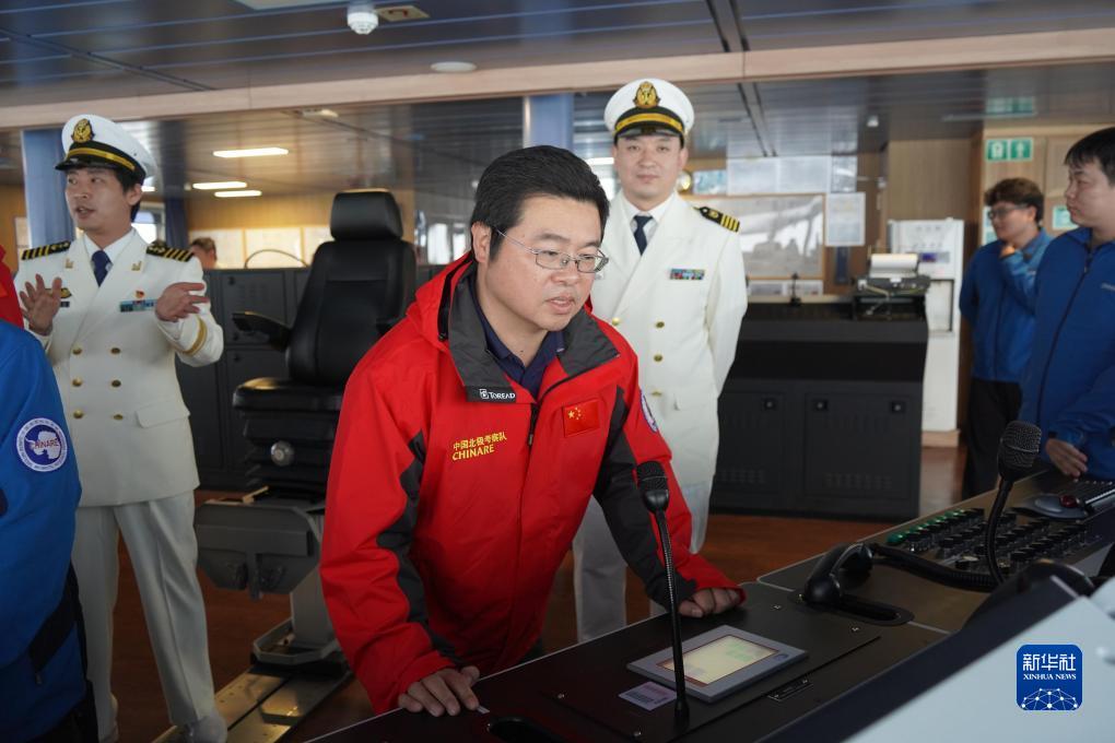這是抵達北極點(diǎn)后,中國第13次北冰洋科學(xué)考察隊領(lǐng)隊王金輝在進(jìn)行全船廣播,向全體隊員通報抵達北極點(diǎn)的消息(9月5日攝)。