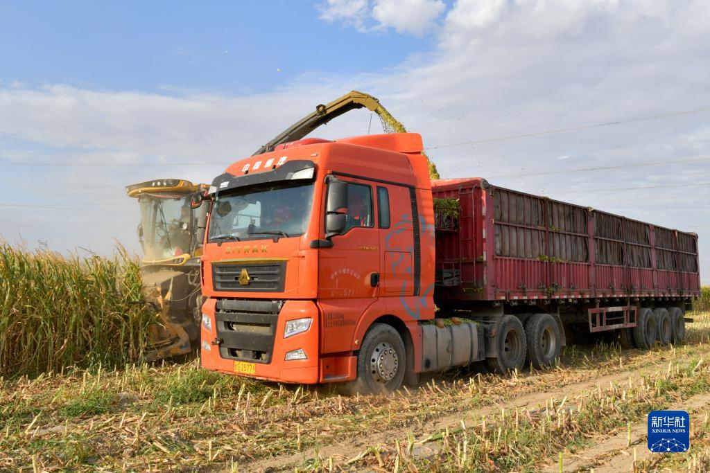 9月5日,在張掖市山丹縣位奇鎮四壩村,工作人員使用大型機械收獲青貯玉米。